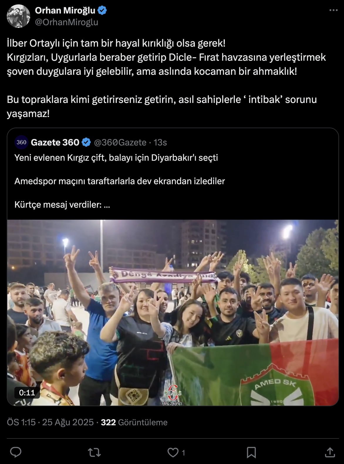 Sosyal medya hesabından balayı için Diyarbakır’ı seçen yeni evli Kırgız çiftin Kürtçe konuştuğu videoyu paylaşan Miroğlu, şunları yazdı: