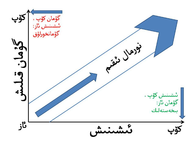 يۇقارقى گىرافىكتە كۆرسىتىلگەندەك، ئەگەر يالغۇز ئىشىنىش بولۇپ، پەقەت گۇمان قىلىش بولمىغاندا، بىخەستەلىك كىلىپ چىقىشى، ئاسانلا باشقىلارنىڭ ئالدام خالتىسىغا چۈشۈپ، بىۋۇدە زىيان تارتىشىمىز مۈمكىن. ئەگەر يالغۇز گۇمان قىلىش بولۇپ، پەقەت ئىشىنىش بولمىغاندا، گۇمانخورلۇق ئەۋجە ئىلىپ، كىشىلەر ئارىسىدىكى مۇناسىۋەتكە ئىغىر تەسىر يىتىشى ۋە ئويلىمىغان يامان ئاقىۋەتلەر كىلىپ چىقىشى مۈمكىن. كۈندۈلىك ھاياتىمىزدا، گۇمان قىلىش بىلەن ئىشىنىش ئارىسىدا مۇئاپىق بىر تەڭپۇڭلۇق بولىشى بەك موھىمدۇر. (ئەسكەرتىش: بۇ دىگەنلىك ھەرگۈزمۇ گۇمان قىلىش بىلەن ئىشىنىش ئوڭ تاناسىپ بولىدۇ، ئىشىنىش قانچە كۆپ بولسا، گۇمان قىلىشمۇ شۇنچە كۆپ بولىدۇ دىگەنلىك ئەمەس)